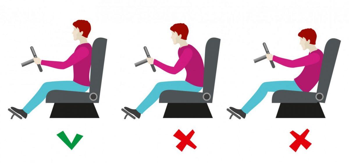Ketika mengemudi, tangan sebaiknya berada pada posisi jam 3 dan 9. Untuk mengetahui jarak yang pas, taruhlah tangan di atas setir lalu duduk pada posisi ergonomis. Pada posisi tangan di atas kemudi, pastikan tangan tidak lurus, namun sedikit menekuk pada bagian siku. Ini dinilai sebagai posisi yang tidak terlalu jauh maupun terlalu dekat.