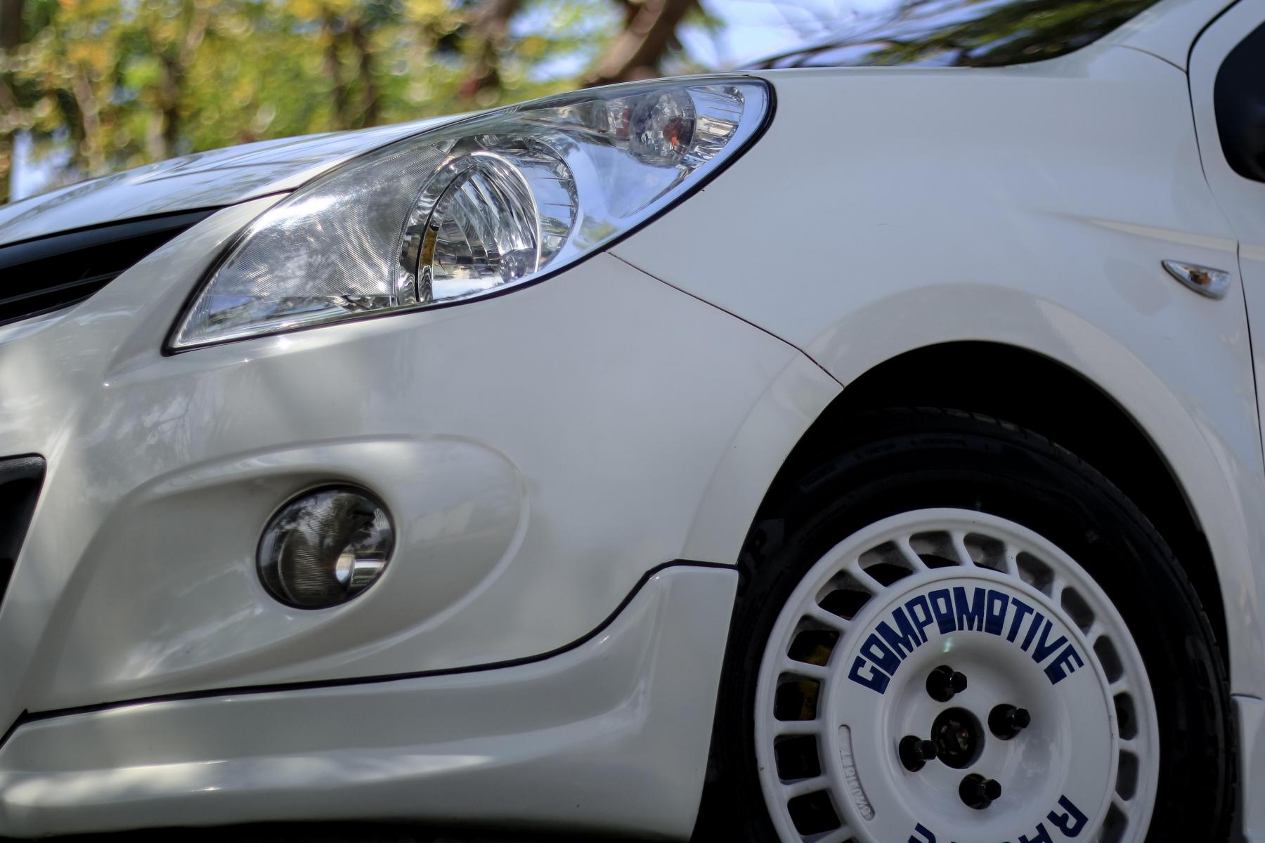 Untuk mendongkrak tampilan i20 miliknya, pria berdomisili Makassar ini menggunakan velg rally Compomotive Motorsport TH dengan ukuran 15x5.5 ber PCD 4x100 ET 44 yang dibalut dengan ban 175/65 agar terlihat tebal. Uniknya, velg ini adalah spesifikasi rally salju sehingga bisa dibilang tidak terlalu lebar.