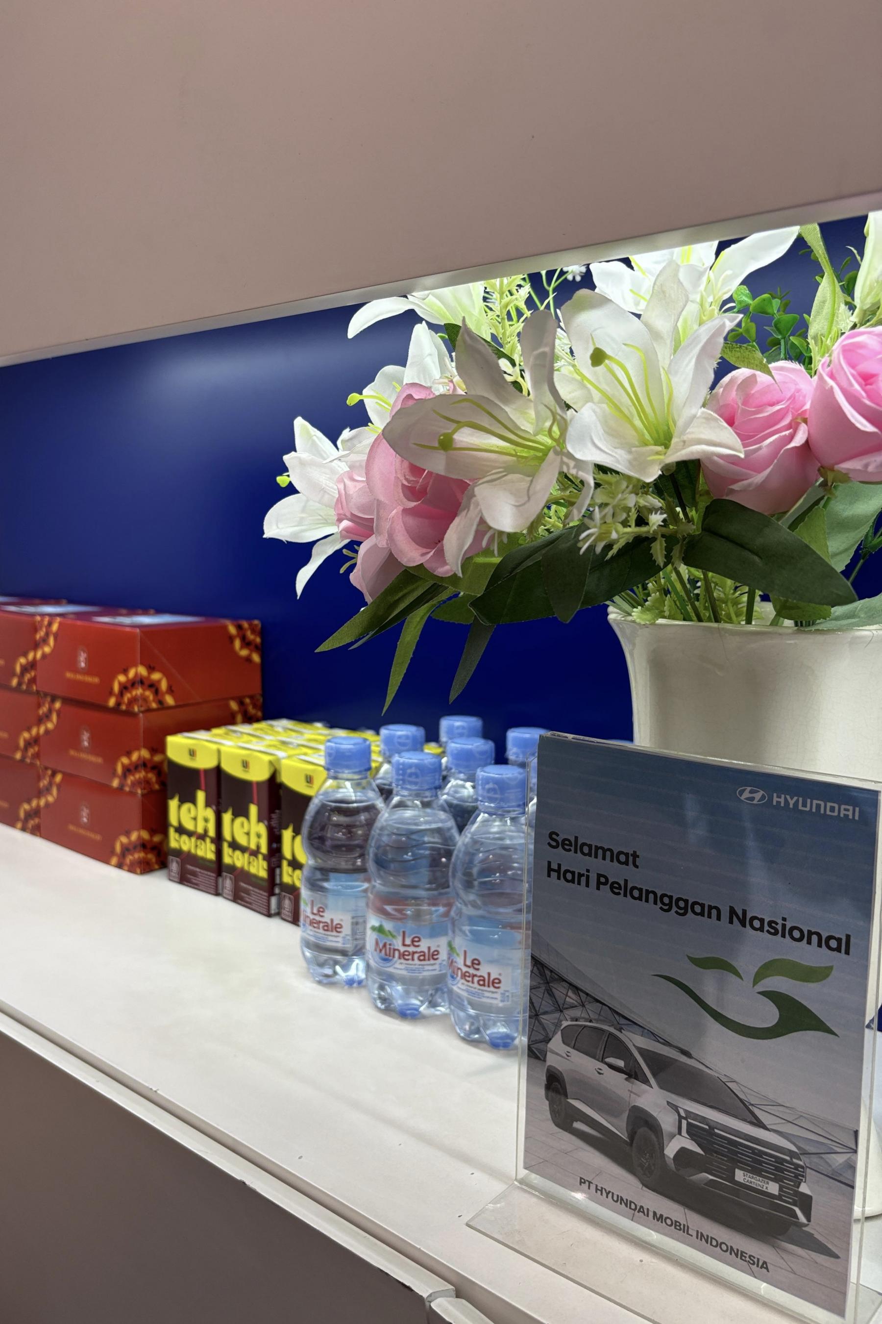Sebagai bentuk terima kasih, setiap pelanggan yang datang akan disuguhi snack dan minuman ringan. Lebih dari itu, PT Hyundai Mobil Indonesia selalu berusaha melakukan perbaikan dari sisi pelayanan Bengkel dengan melakukan Booking Service, membuka lebih awal di beberapa Bengkel dan pelayanan Body & Paint dengan kualitas yang baik dan sesuai standarisasi Hyundai.