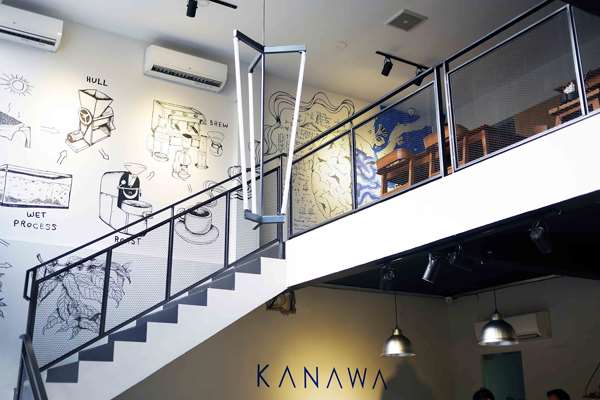 Kanawa Coffee n Munch letaknya bersebelahan dengan Creamatology Coffee Shop. Dengan bangunan 2 lantai, lantai pertama untuk area non smoking dan lantai kedua untuk area smoking. Coffee shop ini unik. Interiornya dihiasi sebuah mobil mini cooper di dekat tangga ootd. Ditambah lagi di bagian dindingnya ada lukisan tangan tentang proses pembuatan kopi. Instagramable banget deh.